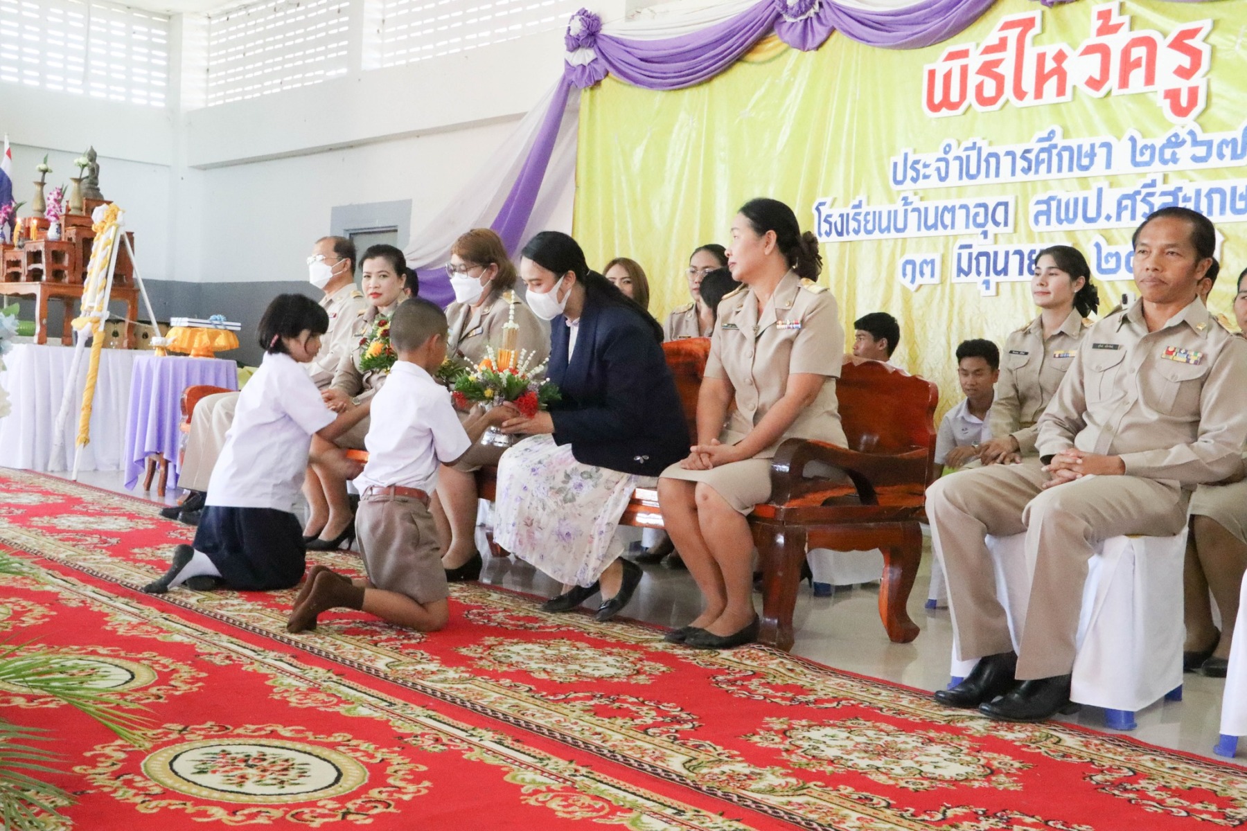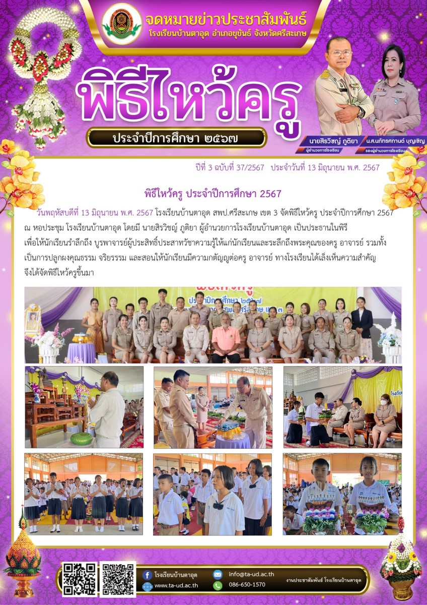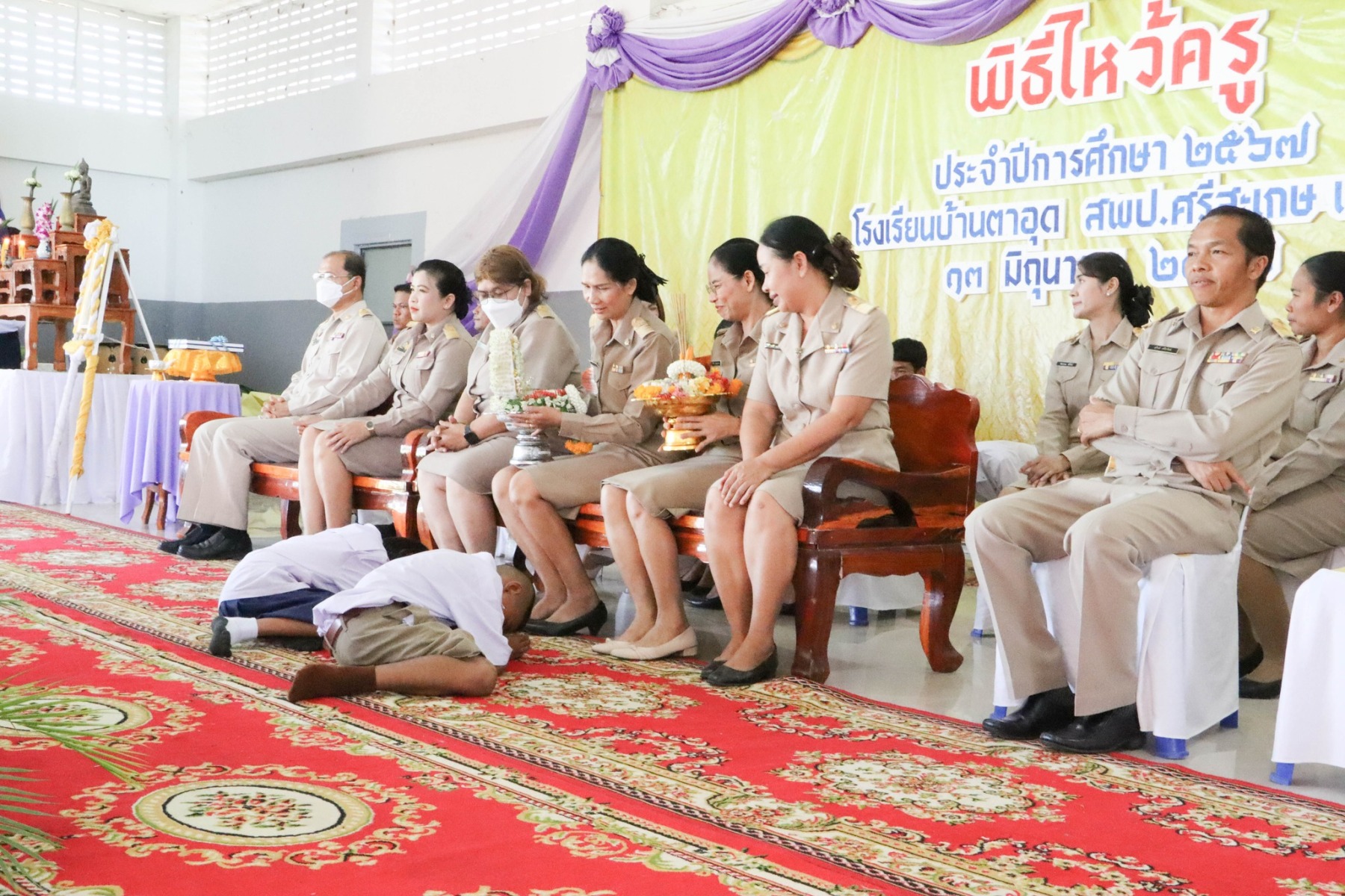 วันพฤหัสบดีที่ 13 มิถุนายน พ.ศ. 2567 โรงเรียนบ้านตาอุด สพป.ศรีสะเกษ เขต 3 จัดพิธีไหว้ครู ประจำปีการศึกษา 2567 ณ หอประชุม โรงเรียนบ้านตาอุด โดยมี นายสิรวิชญ์ ภูติยา ผู้อำนวยการโรงเรียนบ้านตาอุด เป็นประธานในพิธี เพื่อให้นักเรียนรำลึกถึง บูรพาจารย์ผู้ประสิทธิ์ประสาทวิชาความรู้ให้แก่นักเรียนและระลึกถึงพระคุณของครู อาจารย์ รวมทั้ง เป็นการปลูกฝังคุณธรรม จริยธรรม ให้นักเรียนมีความกตัญญูกตเวทีต่อครู อาจารย์ จึงได้จัดพิธีไหว้ครูขึ้นมา
